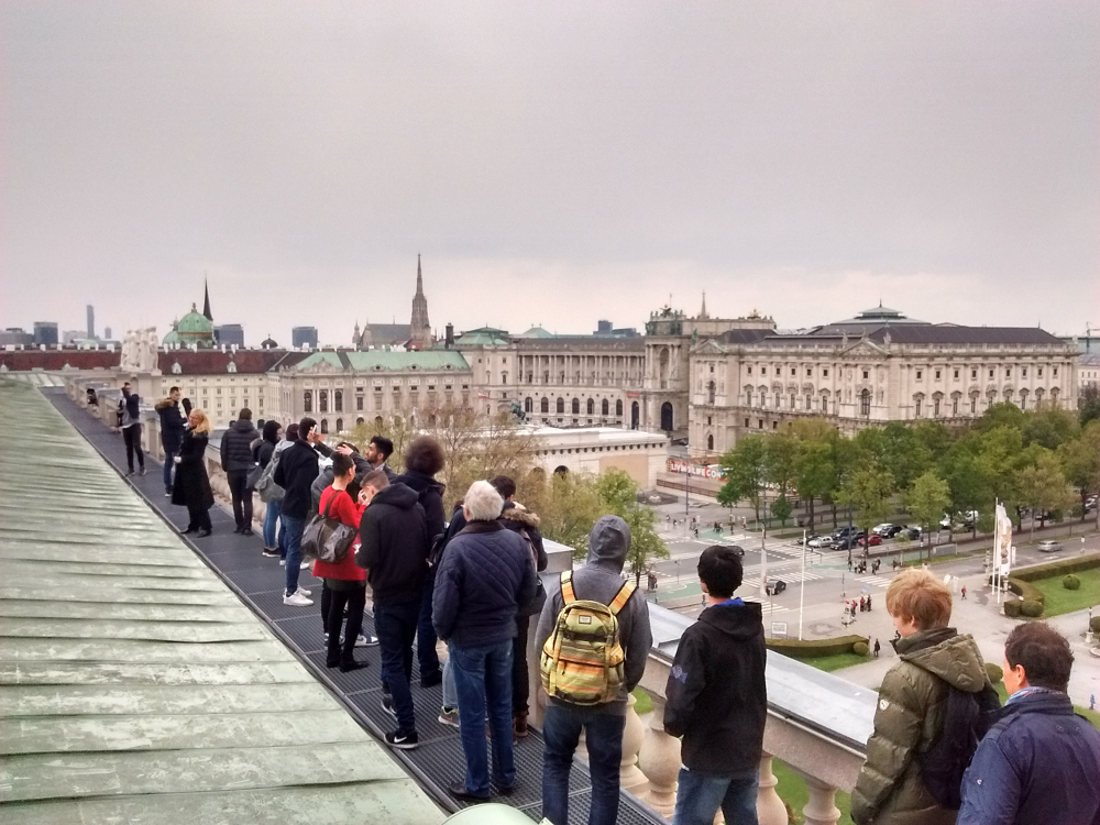 Zum Abschluss konnten wir dann noch rauf auf das Dach des Museums, wo man hoch über die Dächer von Wien einen wunderbaren Blick auf die Hofburg und das Parlament hatte. Danach ging es nach einer kurzen Runde im regulären Teil des Museums (zu den Dinos und ins Goldkabinett) und einer Kaffeepause wieder mit der Westbahn zurück nach Linz.
