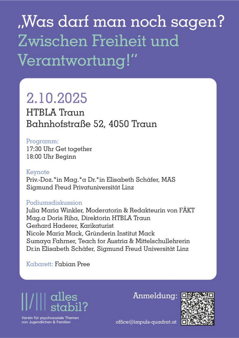 Eintritt frei. Anmeldung: office@impuls-quadrat.at