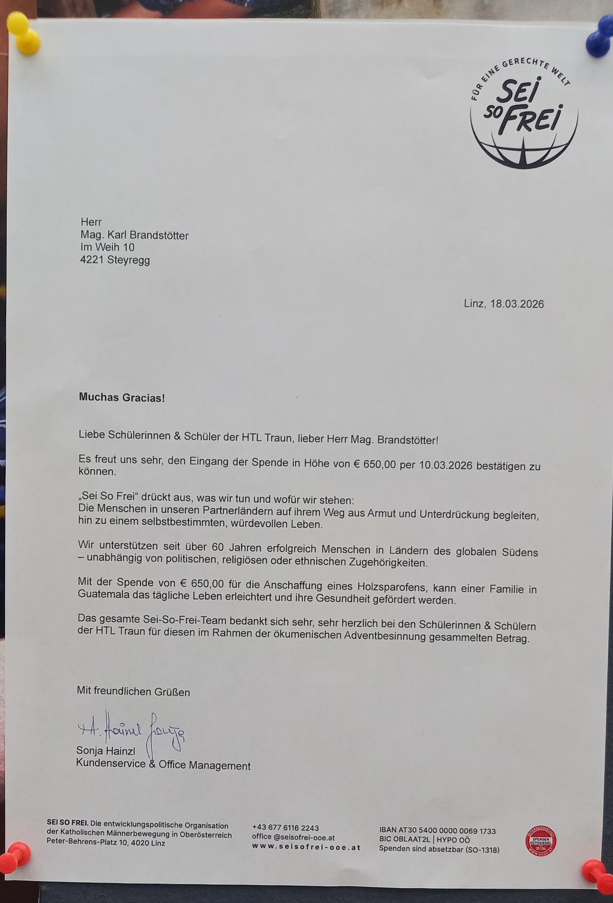 Spendenaktion im Rahmen des christlichen Religionsunterrichts