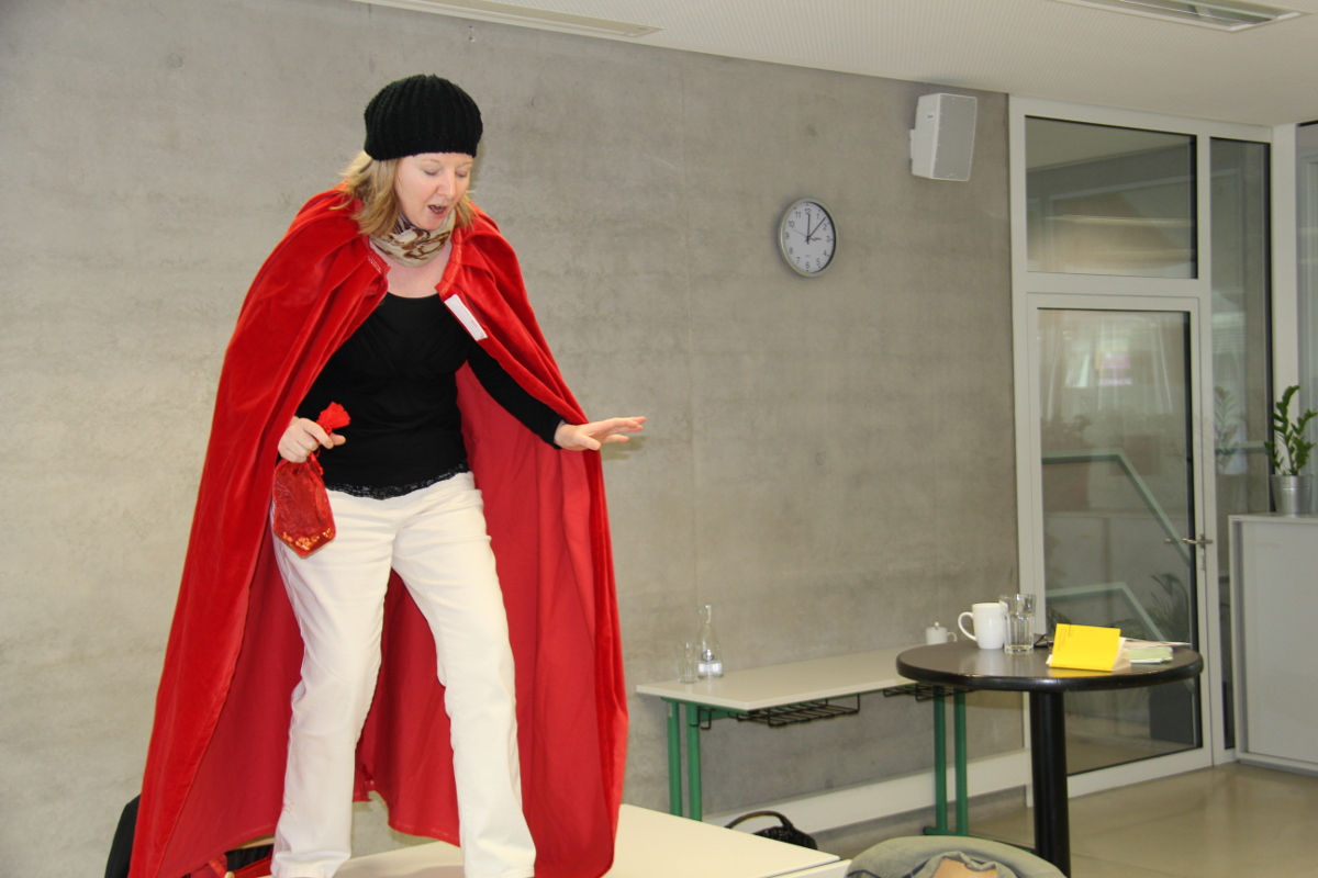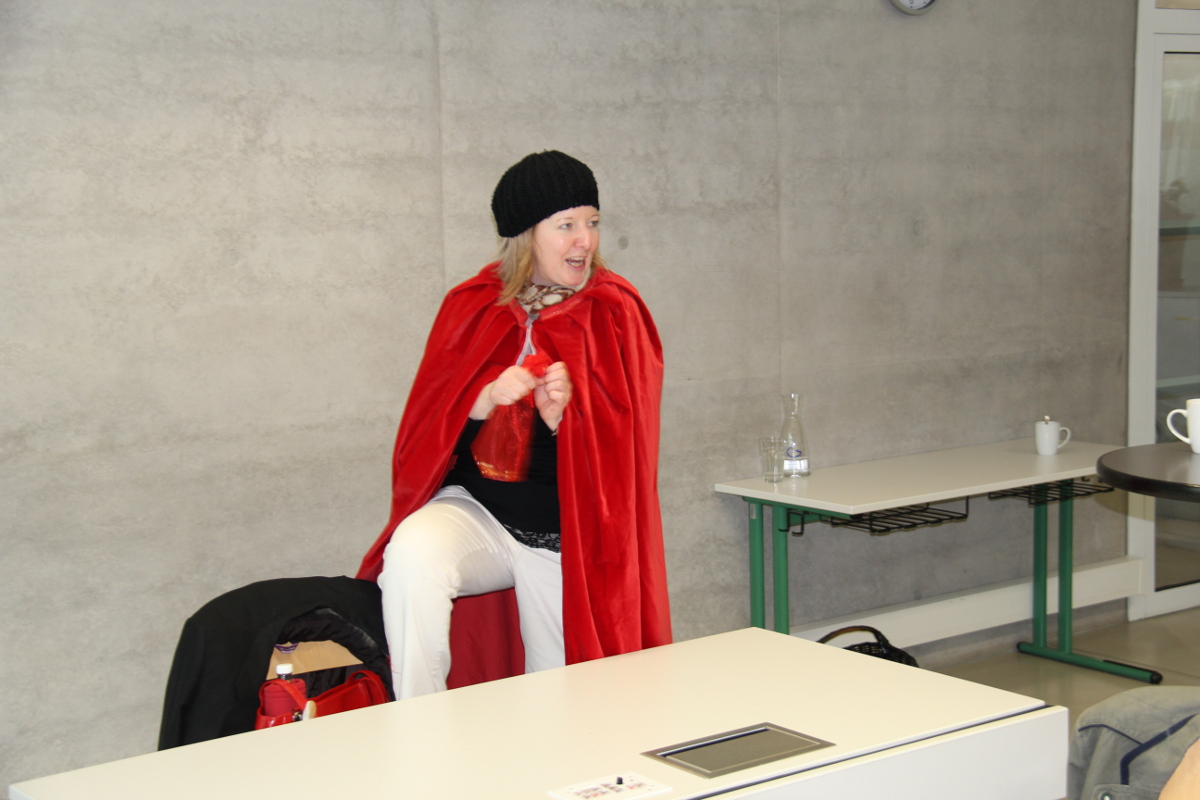 Nach einführenden Informationen zu Autor und Stück vermittelte die Künstlerin im Wechselspiel von szenischer Darstellung und interaktiver Erzählung den Verlauf der turbulenten Verwechslungskomödie. Der Name des Stückes rührt von der Angst her, die die Hauptperson Wendelin nach einem vermeintlichen Teufelspakt vor der Hölle hat. Mit ihrer humorvollen Darstellung und Wandlungsfähigkeit konnte die Schauspielerin bei den Schülern die Neugier und Lust wecken, sich mit einzelnen Szenen mit verteilten Rollen auseinanderzusetzen und anschließend dem Publikum zu präsentieren.