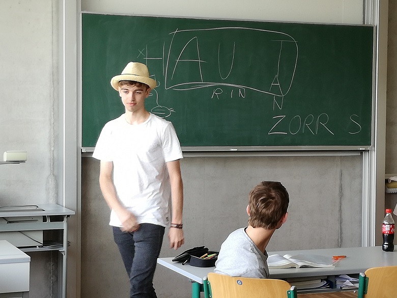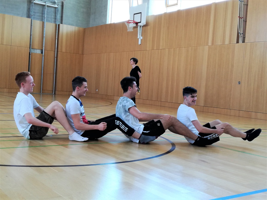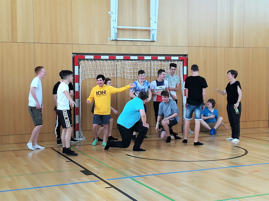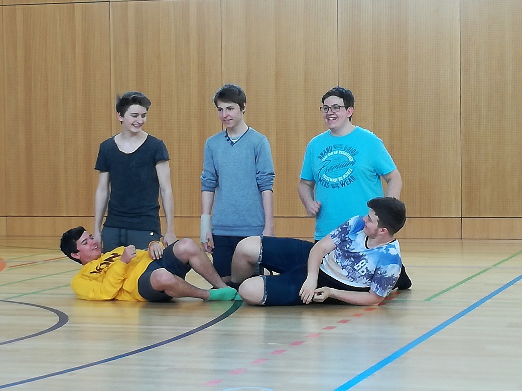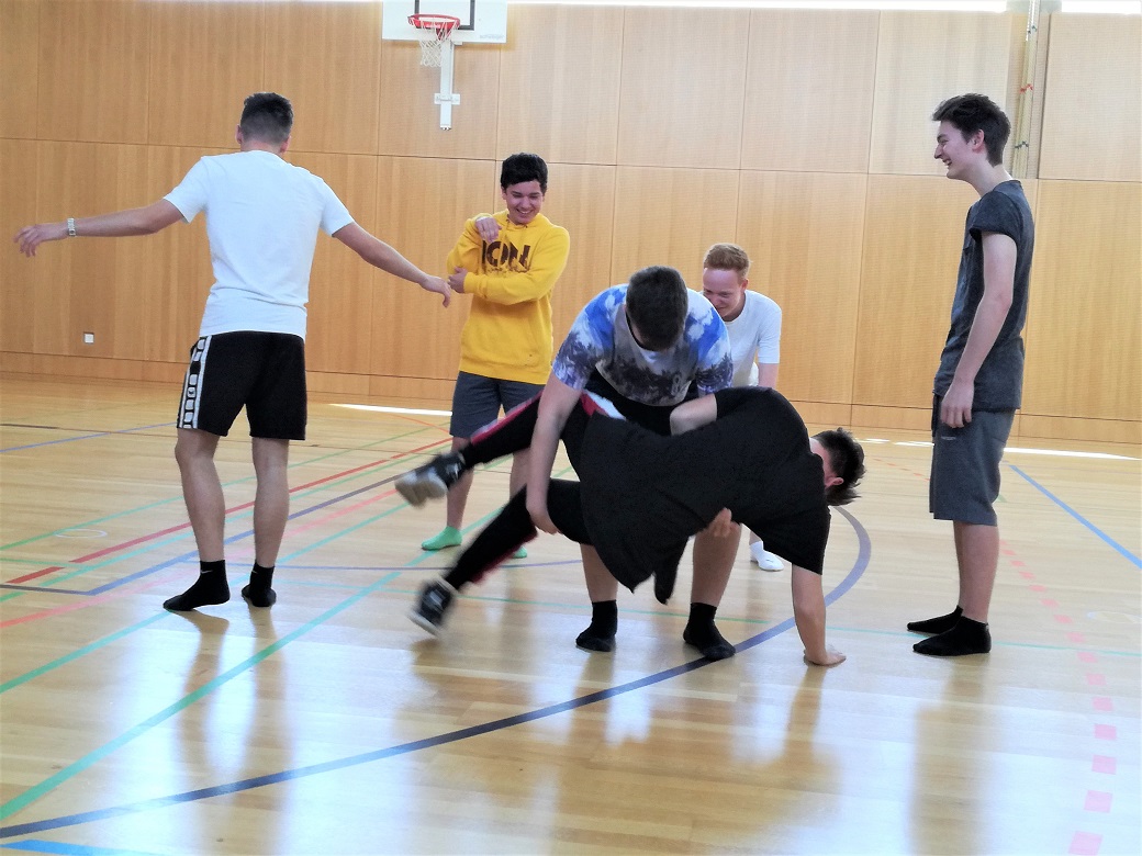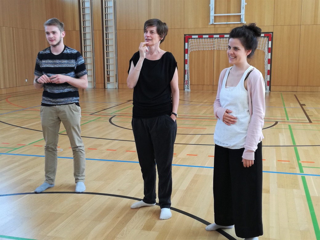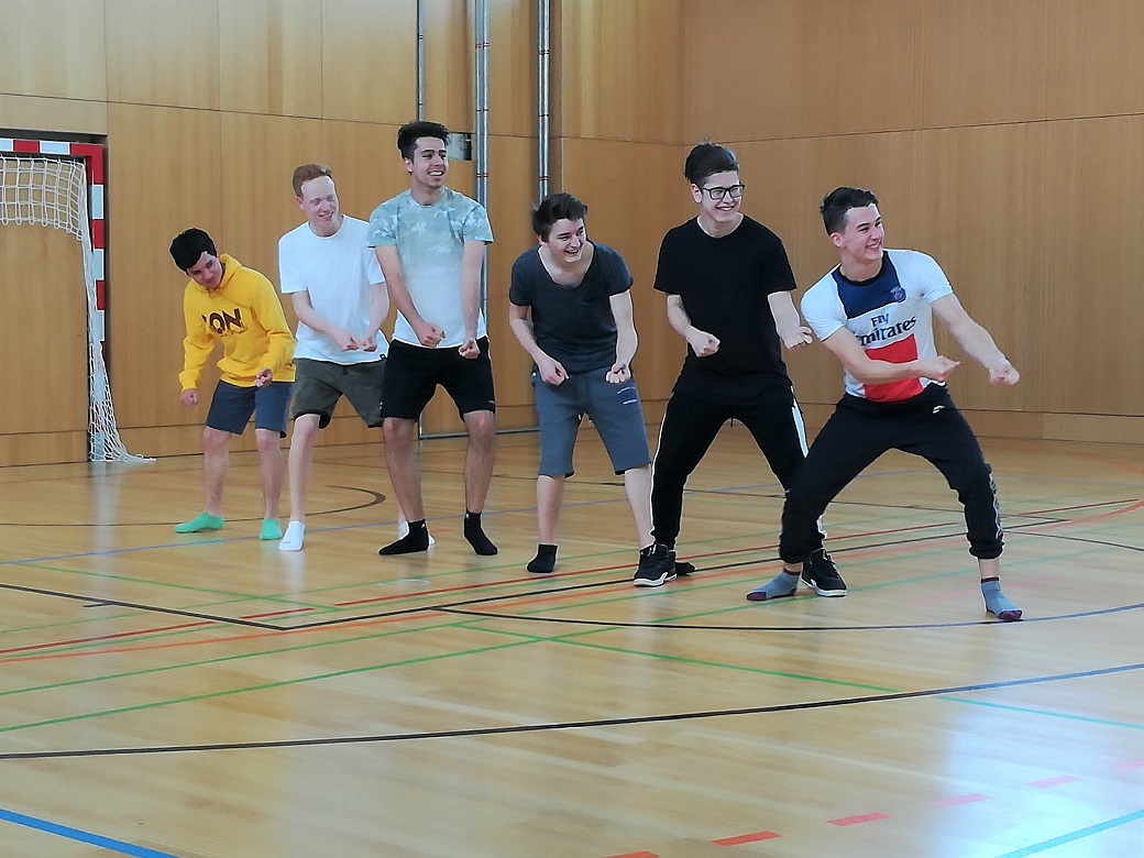 Nach kreativer Pause und Ortswechsel in den Turnsaal überraschen die Schüler mit Theatersport sowie Gruppenpräsentation ihrer in Kürze erarbeiteten Bewegungsskizze: Tatkräftige Handlungen, stark in ihrer szenischen Darbietung, originell, lustig. Chapeau!