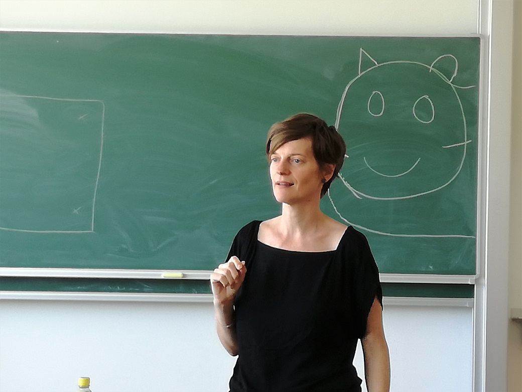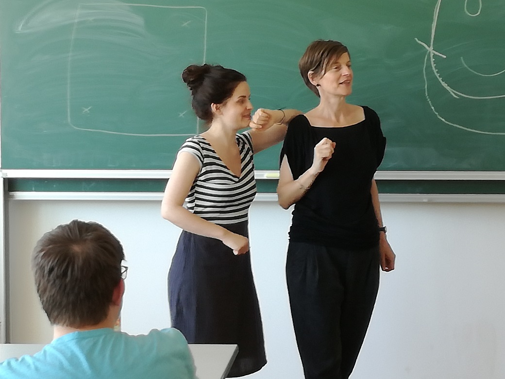 Katharina ist stets umsichtig und bereit, in einer Übung mit den Schülern eine Rolle zu übernehmen oder zusammen mit Michaela eine neue Szene vorzustellen. Eine große Motivation für eigenes Spielen mit Sprache und Körper sind für die Teilnehmer die Improvisationen der beiden Künstlerinnen. Humorvoll, witzig, einladend.