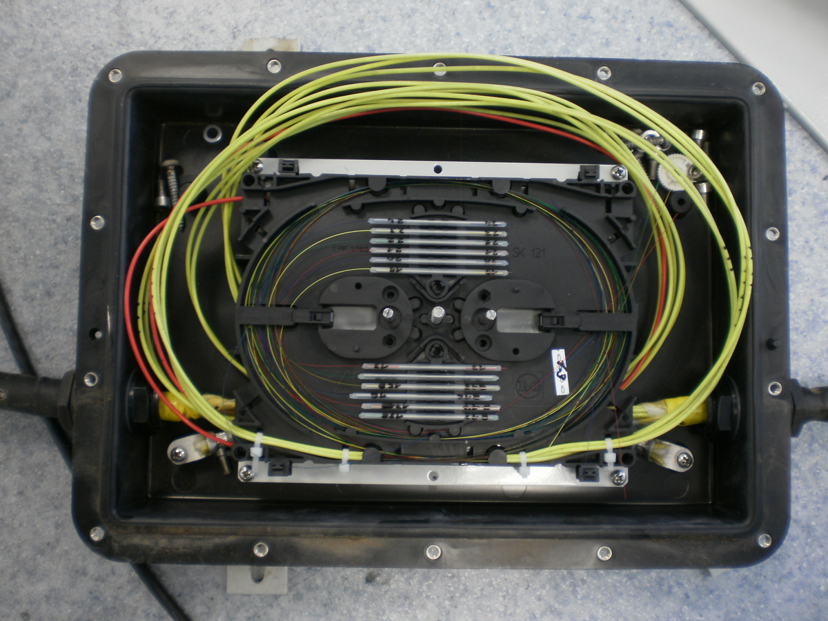 Herr S. schultert den Sonnenschirm, nimmt seine Koffer in die Hand und geht den kurzen Zufahrtsweg hinunter. Dort angekommen klappt er den Sonnenschirm auf, setzt sich hin und öffnet die Koffer... Kein schöner Tag zum Arbeiten! Seine Koffer sind der Messkoffer und die Spleißausrüstung, mit denen er bei Schneefall und klirrender Kälte seinen Arbeitsplatz einrichtet. Der Sonnenschirm dient als Schutz vor Schneefall, er sitzt mitten im Feld bei einem Hochspannungsmasten. Nun wird eine Muffe gespleißt...